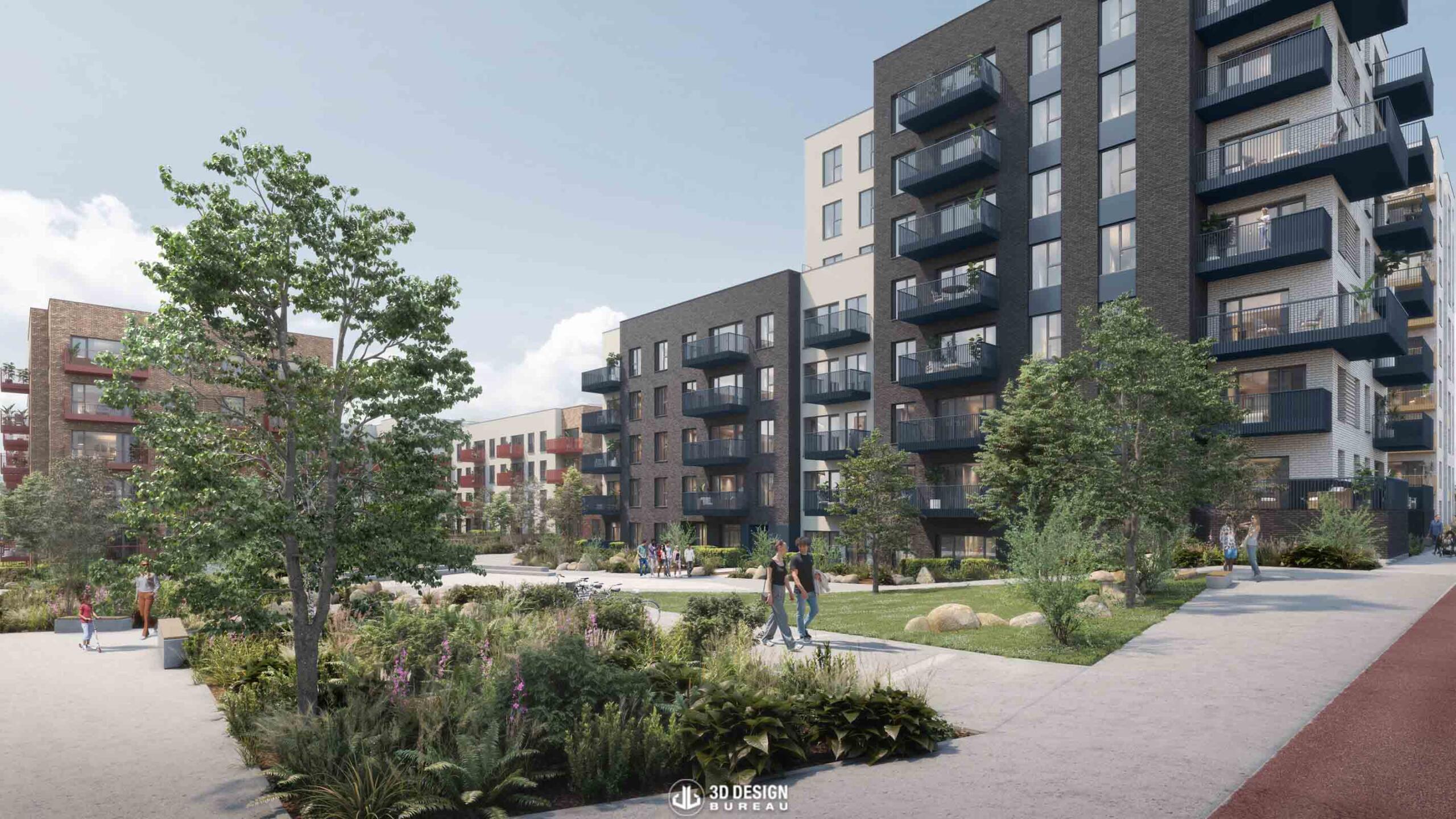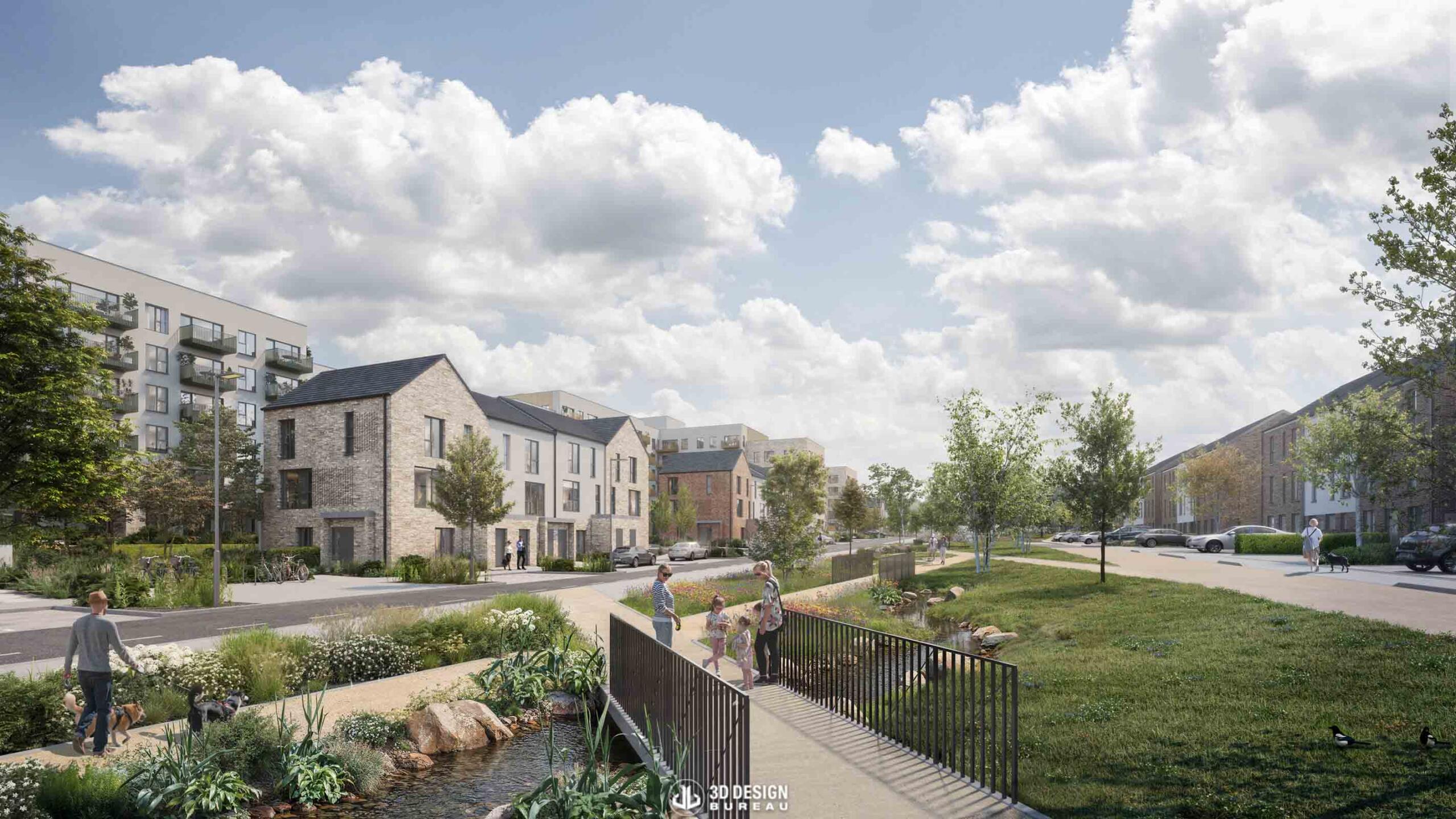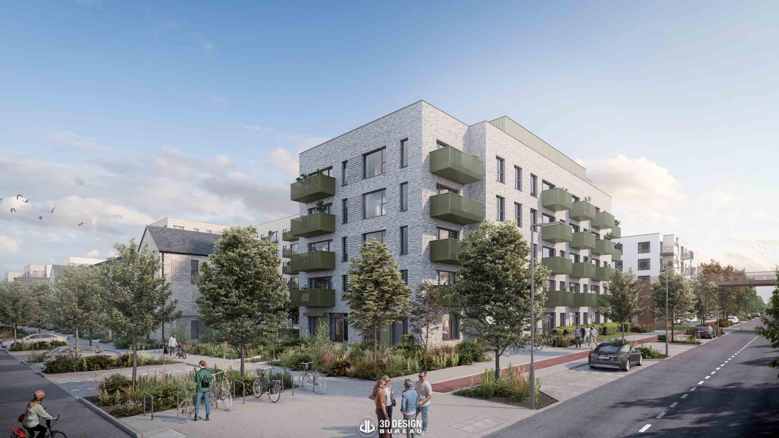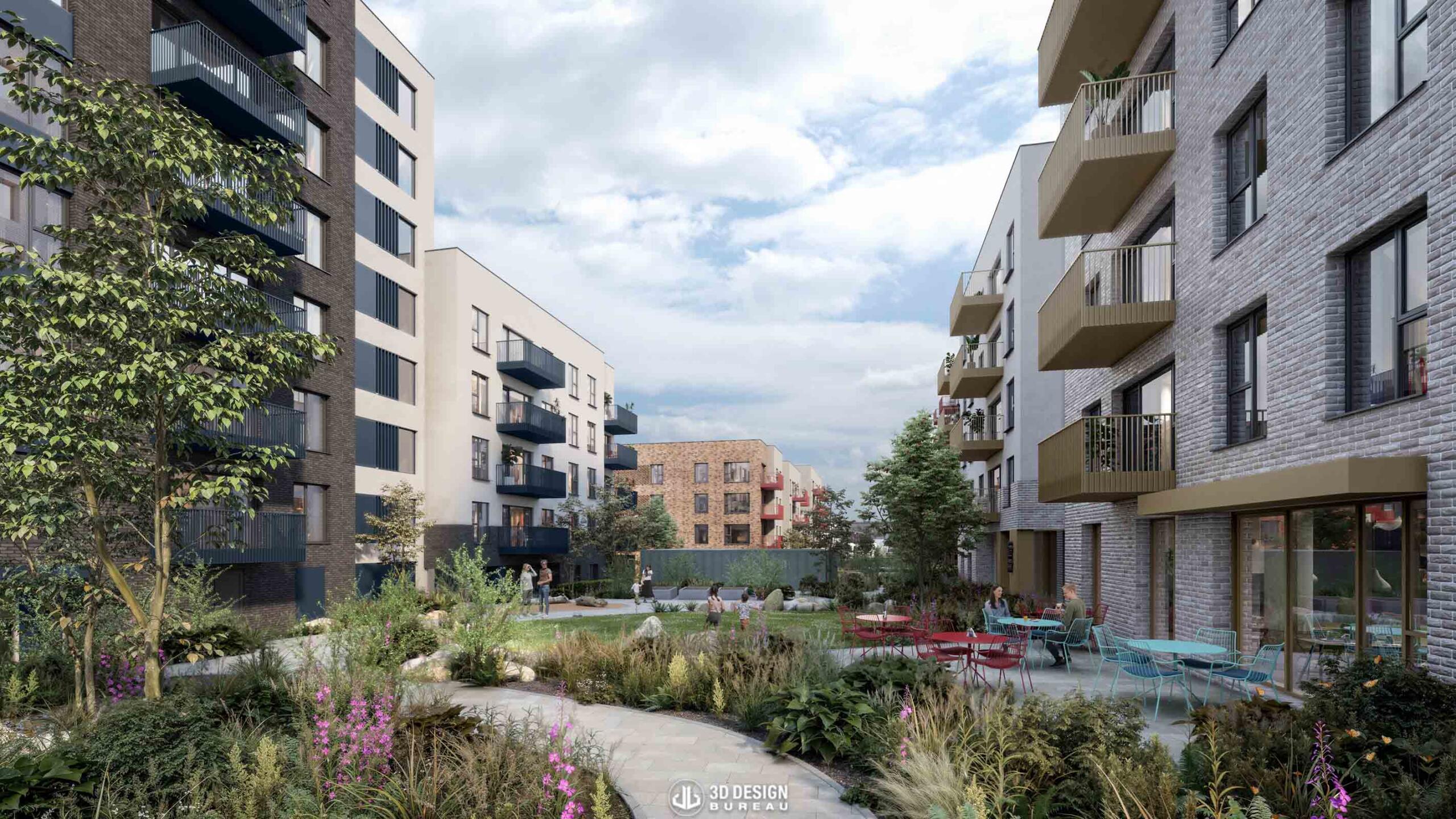 Architectural CGIs were a key component of this phase. The visuals needed to clearly communicate the scale of the development. Working collaboratively with the design team, we selected appropriate viewpoints, primarily streetscape views, which showcase the different residential blocks while also highlighting the public open spaces and shared amenities planned throughout the scheme.