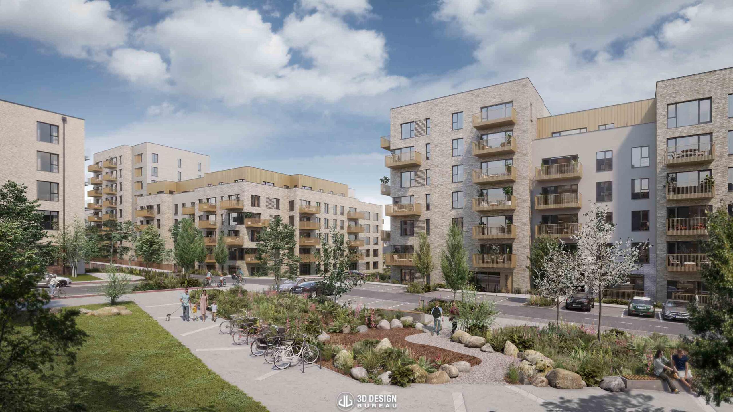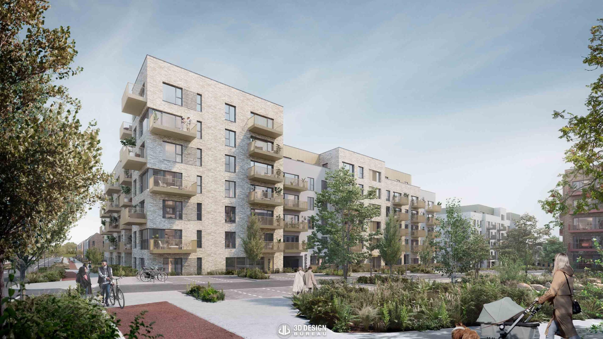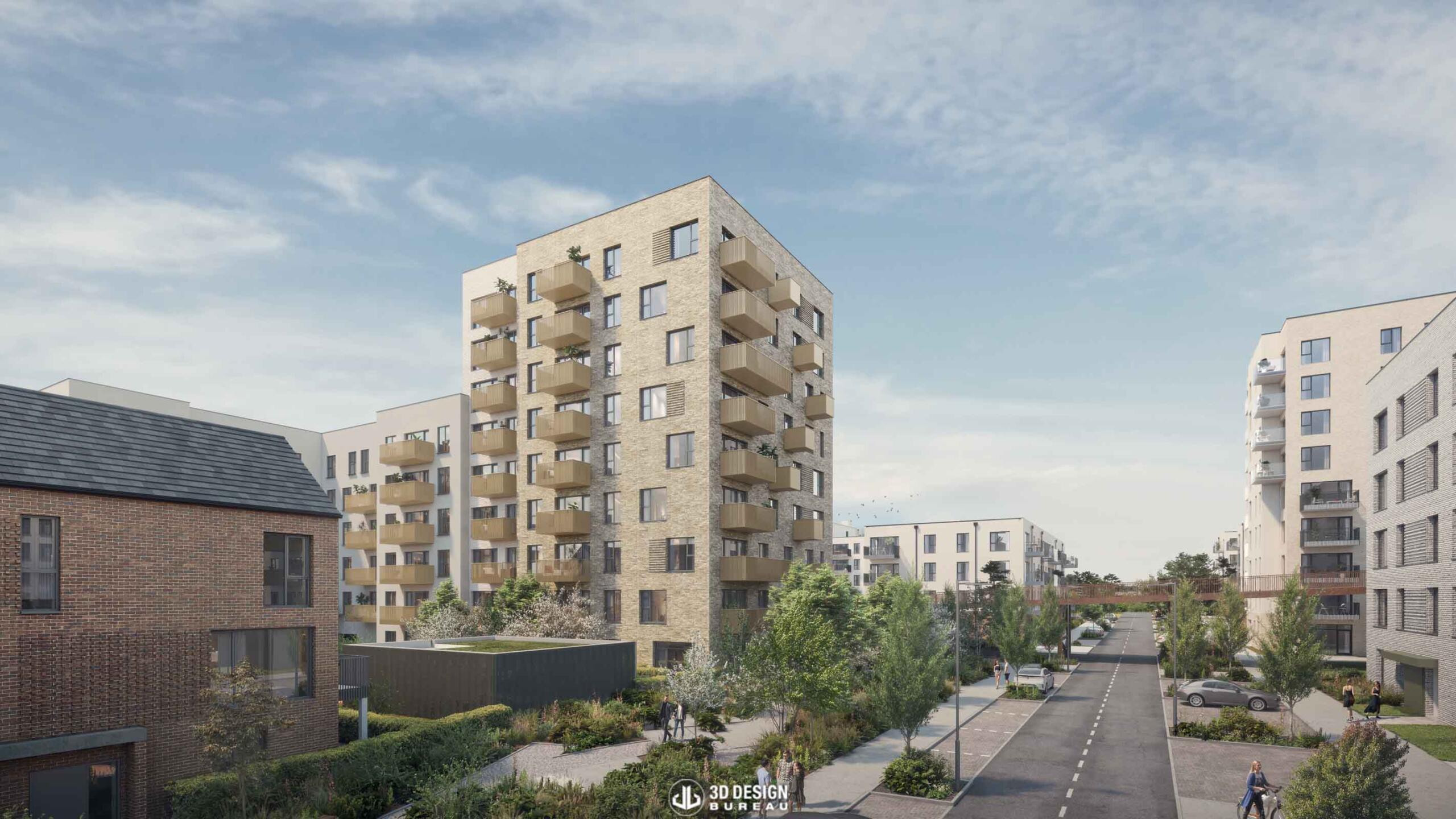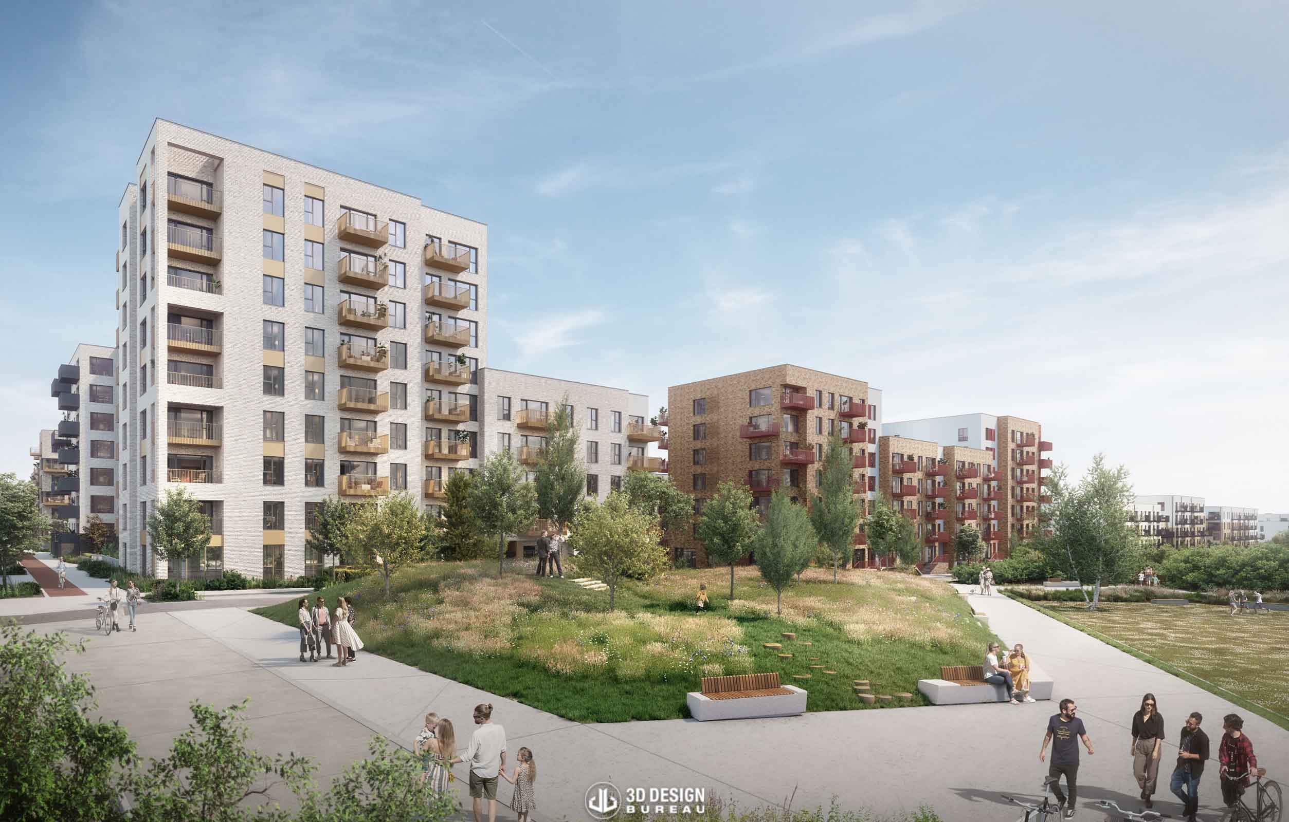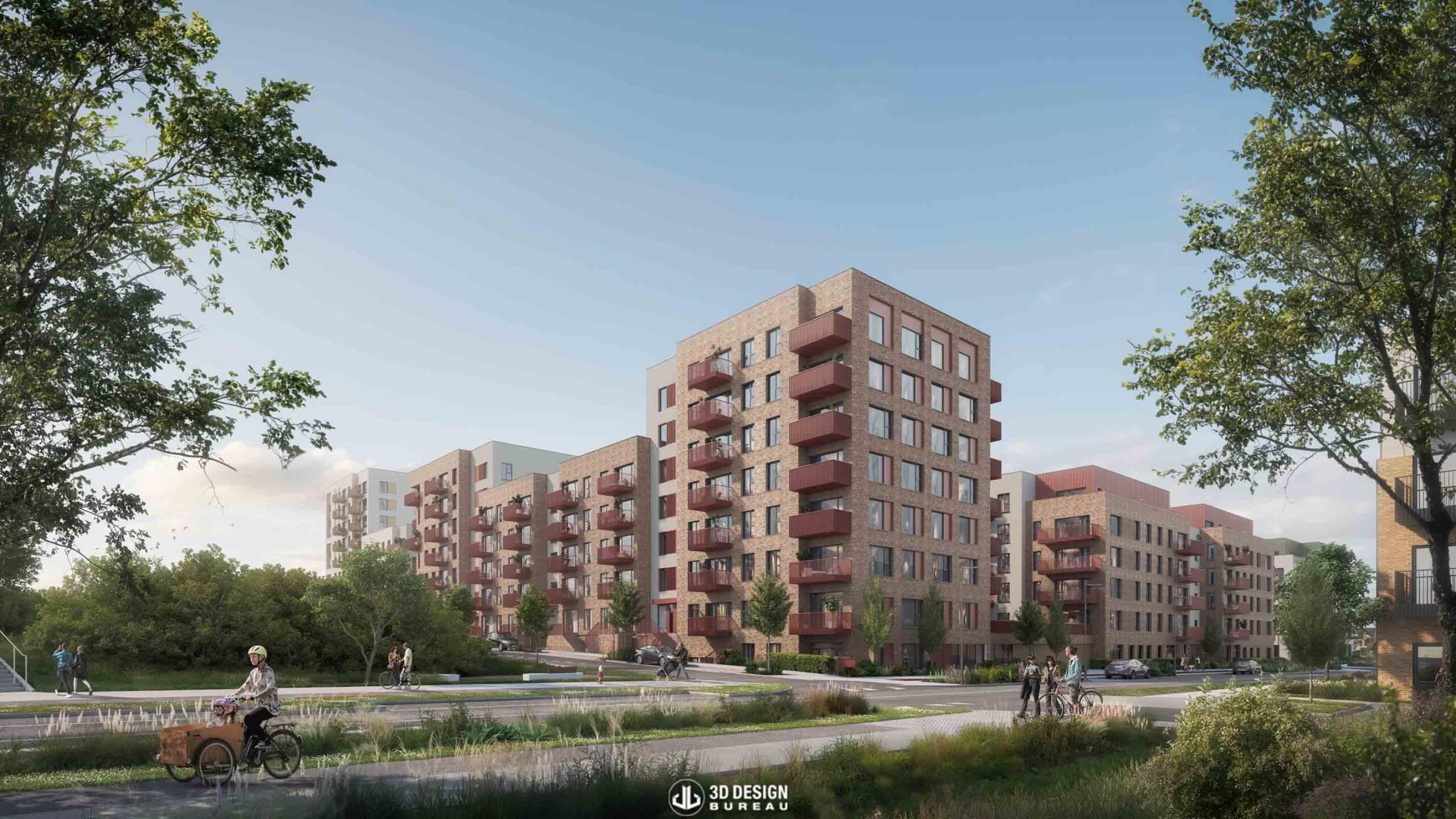 Architectural CGIs were a key component of this phase. The visuals needed to clearly communicate the scale of the development. Working collaboratively with the design team, we selected appropriate viewpoints, primarily streetscape views, which showcase the different residential blocks while also highlighting the public open spaces and shared amenities planned throughout the scheme.