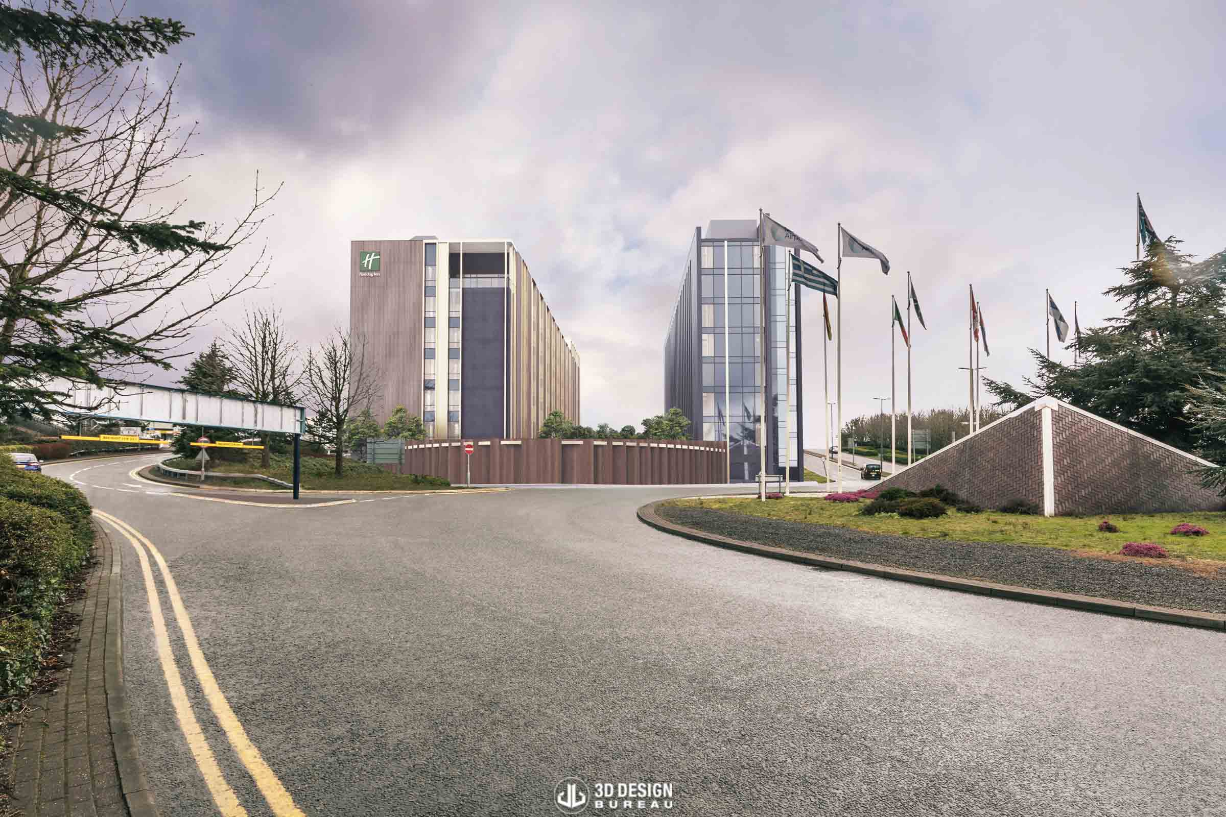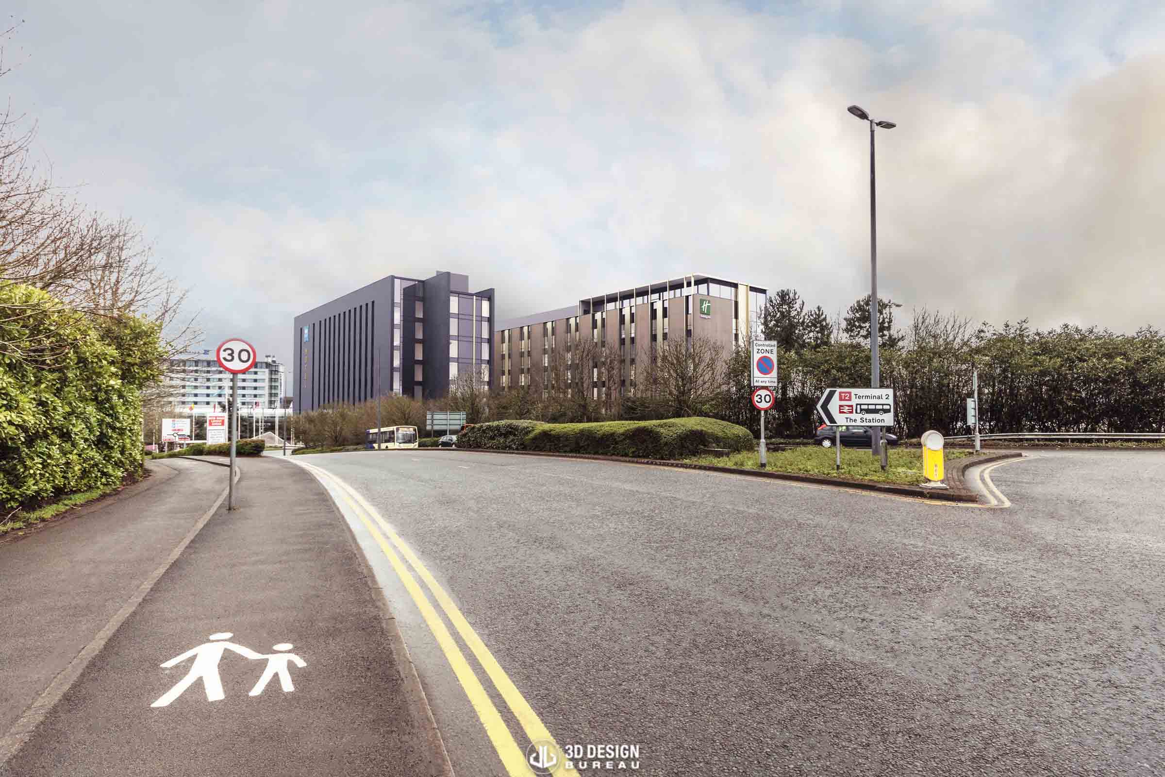 From there, our visualisation and post-production teams produced a set of verified view montages and presentation photomontages. For the verified views, the focus was on accuracy, embedding the model into the surveyed photography and following our established methodology to create the most reliable representation of the proposed hotel.