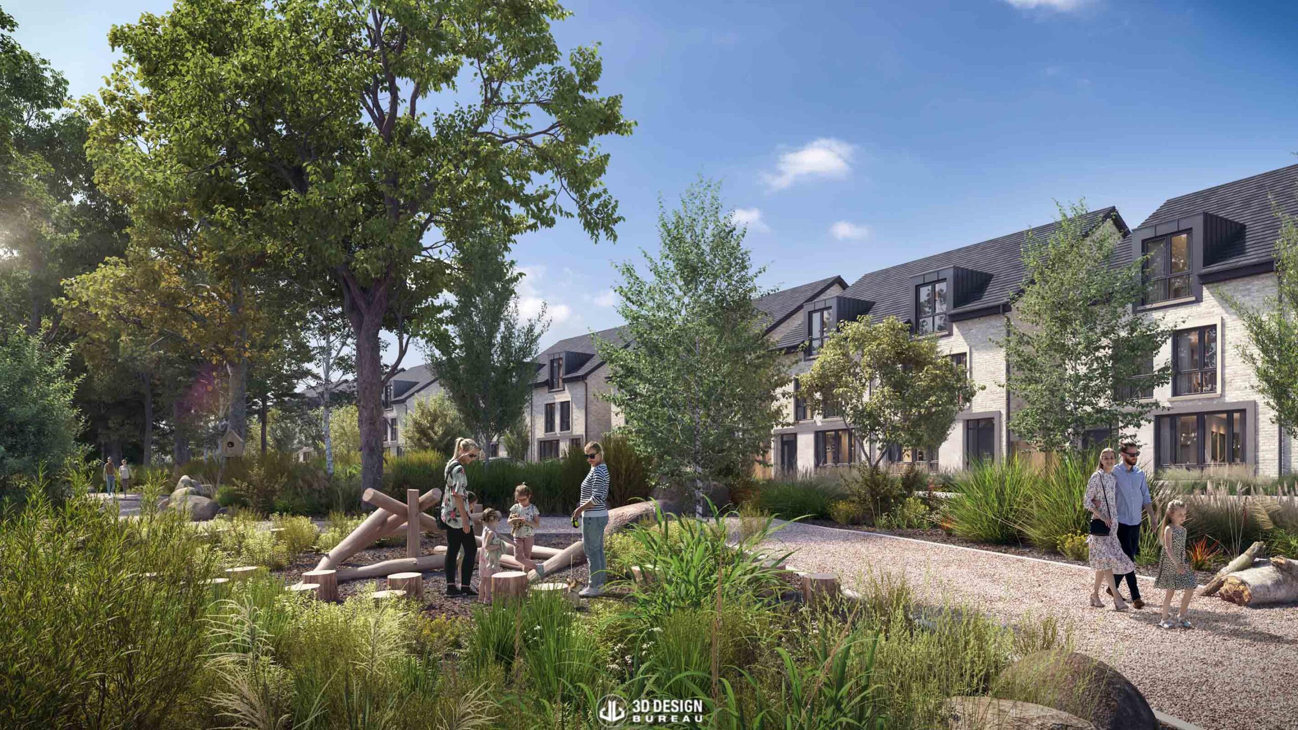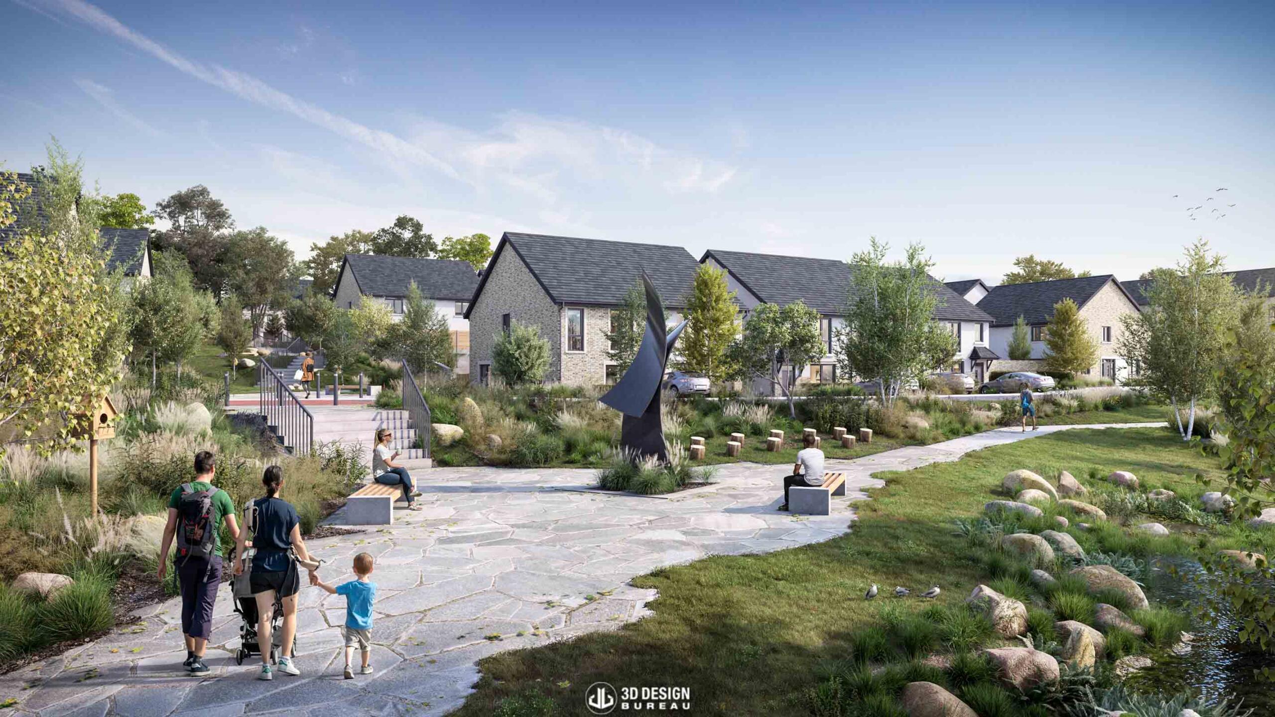 For the architectural CGIs, our team strategically positioned cameras within the model to showcase the variety of house types (houses, duplexes, and apartments) featured in the scheme, as well as the public open spaces that will improve the living experience of future residents.