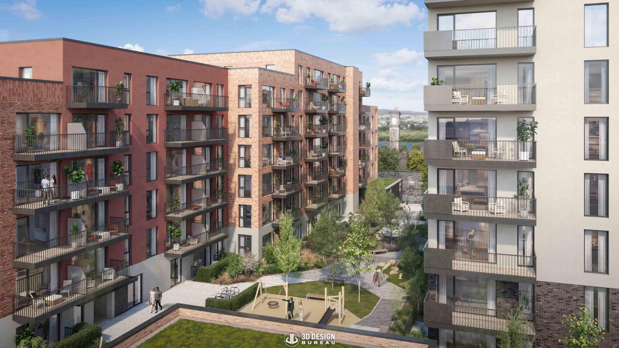 These high-fidelity visuals play a crucial role in the planning process, allowing stakeholders and planning authorities to fully understand the architectural intent and the development’s visual impact on the surrounding Dock Road streetscape.